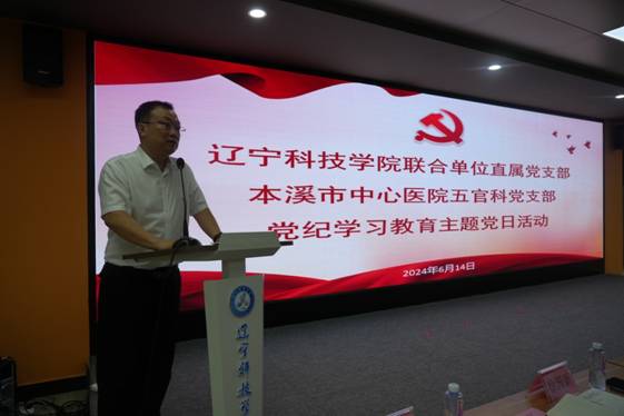 为深入开展党纪学习教育,进一步提高党员的纪律意识,加强党性修养,日前,辽宁科技学院联合单位直属党支部与本溪市中心医院五官科党支部在我校共同举办了党纪学习教育主题党日活动。我校纪委书记闫海军、党委宣传部部长于泳、联合单位党支部书记李昱献,市中心医院五官科支部书记祁辉,两个支部的全体党员参加此次党日活动。活动由李昱献主持。