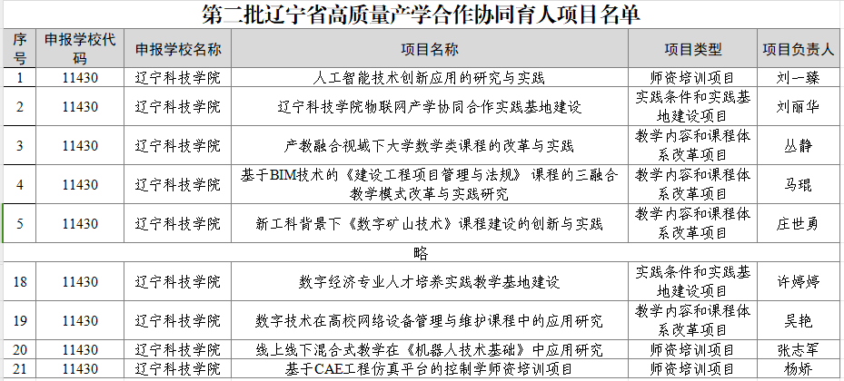 近日,辽宁省教育厅发布了《关于公布第二批辽宁省高质量产学合作协同育人项目名单的通知》(辽教通〔2024〕503号)。学校共计21个项目获批第二批辽宁省“高质量产学合作协同育人项目”。其中,教学内容和课程体系改革项目10项,师资培训项目6项,实践条件和实践基地建设项目4项,新工科、新文科建设项目1项。