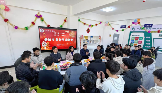 一元复始开新篇,润育成长话未来。2025年1月1日,校党委书记赵毅、校长李卫民和副校长葛会奇共同走访慰问了元旦期间辛勤值守在一线的学生工作队伍,带来了学校党委的关心厚爱,为他们送上了新年的诚挚问候和衷心祝福。在“一站式”学生服务大厅校领导与住校学生代表和各学院学生工作负责人共聚一堂,师生畅谈共话未来。党政办公室白丽冰主任、各学院党总支副书记、住校学生和少数民族学生代表30人参加了茶话会,会议由学生工作处处长于红斌主持。