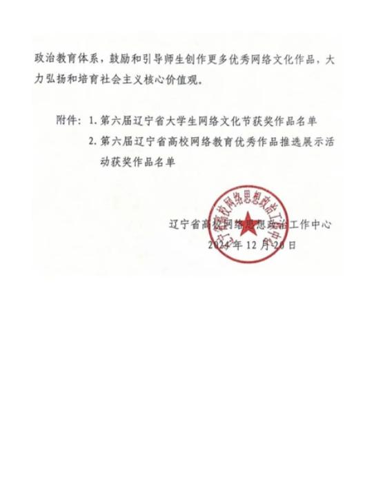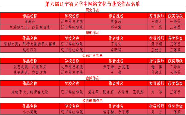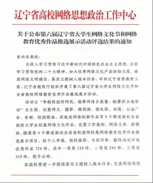 近日,由中共辽宁省委教育工委、辽宁省教育厅组织开展的第六届辽宁省大学生网络文化节和全省高校网络教育优秀作品推选展示活动评选结果公布,我校师生共荣获8项奖项,其中一等奖1项,二等奖3项,三等奖4项。