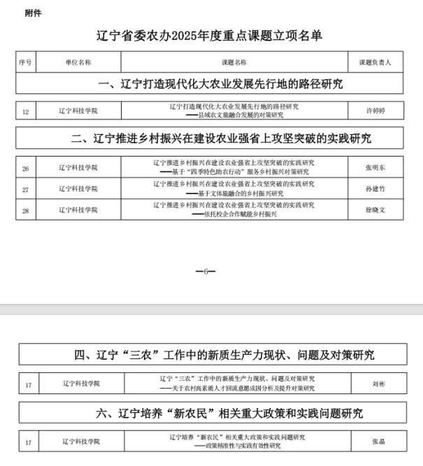 近日,中共辽宁省委农村工作领导小组办公室发布《中共辽宁省委农村工作领导小组办公室关于2025年度重点课题立项的通知》,我校遴选推荐的《县域农文旅融合发展的对策研究》《基于“四季特色助农行动”服务乡村振兴对策研究》等6项课题成功入选,体现了学校在服务乡村振兴战略中的积极作为和责任担当。