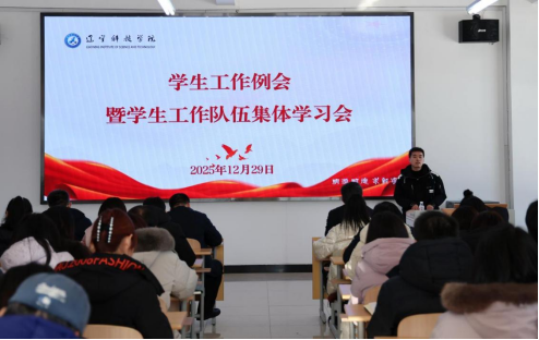 12月29日,辽宁科技学院学生工作例会暨学生工作队伍集体学习会在智慧东楼101室召开,副校长闫海军参加会议并讲话。学生工作处、招生与就业处、团委全体工作人员,各学院党总支副书记及全体专职辅导员参加,会议由学生工作处副处长赵海涛主持。