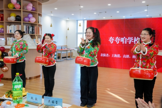 文艺演出环节精彩纷呈。外语学院教师演绎的英文版《我和我的祖国》,以别样形式表达对祖国的深情;经济与管理学院的诗朗诵《逐光杏坛》,娓娓道出教育工作者的初心与坚守;双创学院带来的古筝曲《渔舟唱晚》悠扬婉转,尽显古典韵味,而三句半《夸夸咱学校》则幽默诙谐、贴近生活,赢得满堂喝彩;图书馆教职工表演的太极功夫扇刚柔并济,展现中华武术之美;马克思主义学院的红色歌曲串烧,唱出不变的初心与担当;退休老教师现场挥毫书写春联,笔墨间流淌着对学校的深厚情谊;体育部的歌舞《不再犹豫》活力四射,点燃全场热情;机关部门的访谈节目《初心对话》,演绎了一堂生动而深刻的特殊党课。一个跨越代际的对话空间、一次初心的寻访、确认与交接,生动展现了薪火相传、立德树人的核心价值;后勤处的曳步舞《向往神鹰》节奏明快,彰显后勤人员的多才多艺;最后,由资土、药化、人艺三学院联合献上的合唱《为友谊干杯》,在声乐博士苗繁昌老师的领衔下,为演出画上圆满句号,悠扬歌声中传递出辽科人真挚深厚的情谊。