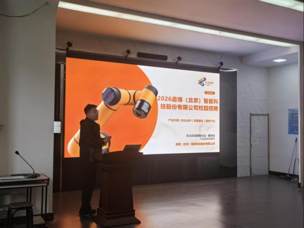 在企业宣讲会上,企业代表通过PPT展示、视频播放等形式,向学生介绍了遨博(北京)智能科技股份有限公司发展历程、核心业务、岗位需求及薪酬福利等内容,并提供了技术维护、内勤和销售岗位等20个工作岗位,现场解答了学生关于职业发展、实习安排等方面的疑问。学生纷纷表示,通过宣讲对企业有了更直观的了解,也明确了自身的职业发展方向,积极递交了应聘简历。