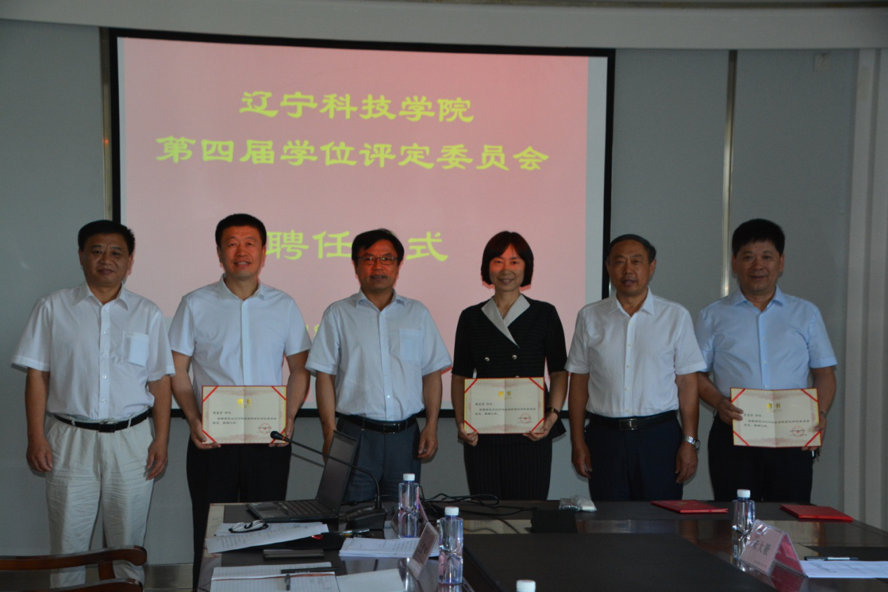 会议首先举行了辽宁科技学院第四届学位评定委员会聘任仪式。陈保东主席宣读《辽宁科技学院关于成立第四届学位评定委员会的通知》(辽科院发〔2018〕43号),并首先向吴国玺、孙国军副主席颁发了聘书,陈保东主席和吴国玺、孙国军副主席向到会的委员颁发了聘书。