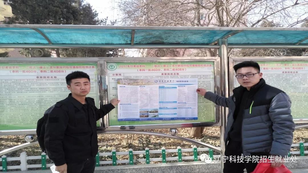 图为招生宣讲队员校园内粘贴我校招生宣传海报