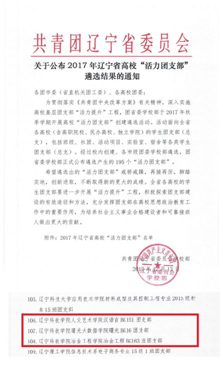 日前,由团省委开展的2017年辽宁省高校“活力团支部”创建遴选结果揭晓,我校冶金工程学院冶金工程BG163团支部、人文艺术学院汉语言BG151团支部、曙光大数据学院曙光BG16团支部被评为辽宁省高校“活力团支部”,全省共遴选产生195个“活力团支部”。