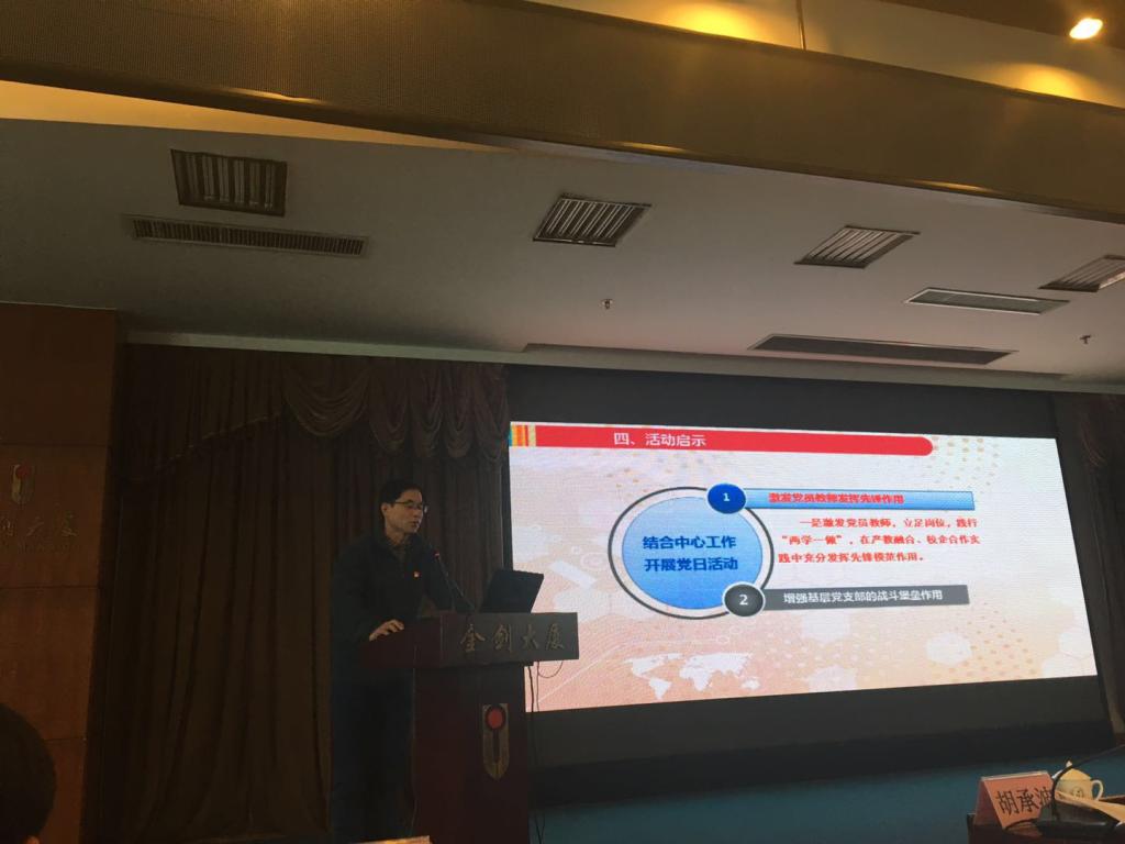 图为电信学院党总支书记方景林作题为“产教融合当先锋 校企合作树典型”现场答辩汇报