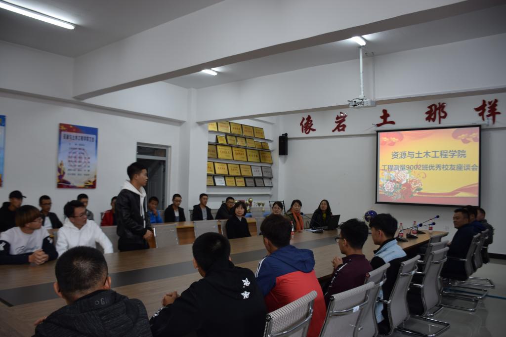 10月12日,天朗气清,惠风和畅,工程测量9002班优秀校友代表陈水生、李云和高树忠回访母校,与资土学院测绘工程专业的在校大学生代表进行座谈交流。资土学院院长韩延清教授、党总支副书记李春燕教授出席了此次活动。