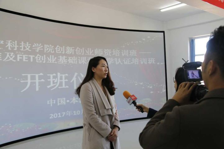 图为创新创业学院副院长韩娇接受本溪电视台采访