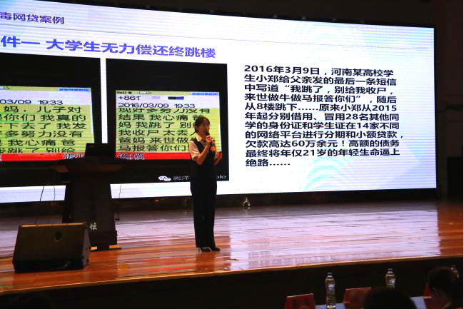 之后由中国银行本溪分行网络安全金牌讲师孟繁莉为大家做了一场“担当社会责任,守卫校园净土”为主题的金融知识讲座,孟老师通过案例再现、情景演示、图片说明、现场问答等方式,从“电信诈骗”亲身经历出发,通过“校园贷的前世今生”、“校园贷的典型案例”、“树立正确的消费观”、“校园贷的几大途径”、“网络安全三不要”这五大方面,为同学们普及了个人信用记录在生活中的重要作用以及金融征信业的有关知识,并通过发生在大学生身上的真实案例给同学们警示教训,使同学们在事例中学习到有关知识,增长了相关经验。与此同时,“情景再现”方式形象的揭露了金融诈骗的常用手段,让大家非常现实感的增强了防范意识,也学会了如何远离网络陷阱,生活在纯净、安全的网络世界,讲座可谓生动而极具深刻教育意义。