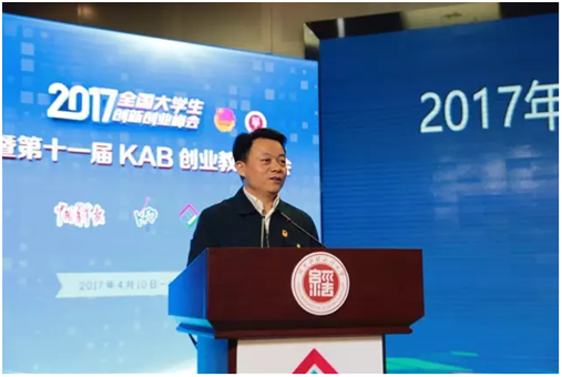 由共青团中央、全国学联指导,全国大学生创新创业联盟、中国青年报社联合主办的2017年全国大学生创新创业峰会暨第十一届KAB创业教育年会于4月10日至11日在河南财经政法大学召开,会议围绕“大学生创新创业与中国经济发展新动能”主题展开。团中央书记处书记傅振邦,中共河南省委常委、组织部部长孔昌生,以及全国大学生创新创业联盟、中国青年报社、团河南省委、河南财经政法大学等主、承办单位的负责同志及支持单位负责人出席了此次活动,全国大学生创新创业联盟常务理事、KAB项目参与高校的师生代表、2016年“大学生创业英雄”称号获得者及部分大学生创业者代表也参加了活动。
