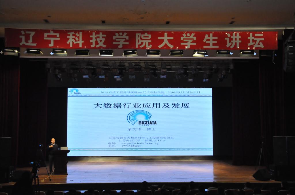 12月16日下午,辽宁科技学院大学生讲坛之余文华专题报告会在艺术楼大学生活动中心成功举行。江苏师范大学特聘教授余文华做客本期讲坛,做了题为《大数据:理论、方法及应用》的精彩报告,大数据学院领导及教师、学生工作处工作人员和900余名学生一同听取了报告会。报告会由学生工作处邱丹硕主持。