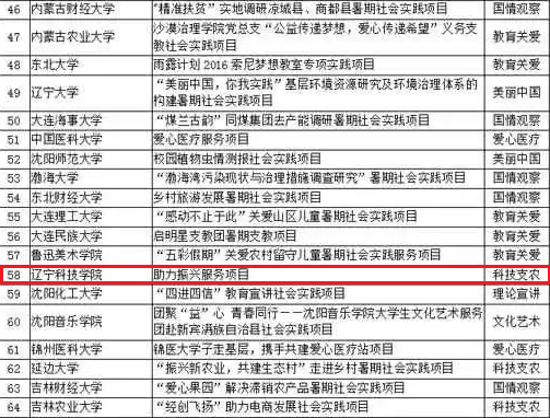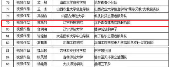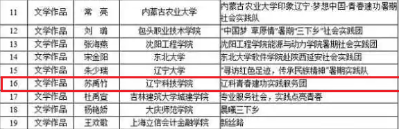 我校资土学院"助力服务振兴社会实践团"获得"最具影响好项目",其中辽宁省共入选14项。机械学院的陈明、资土学院的苏禹竹2名同学获得"实践组织带头人"荣誉称号,辽宁省共入选12人。苏禹竹同学文学作品"青春建功十三五"视频作品“辽科青春建功实践服务团”荣获匠心传递正能量奖全省入选作品4部。