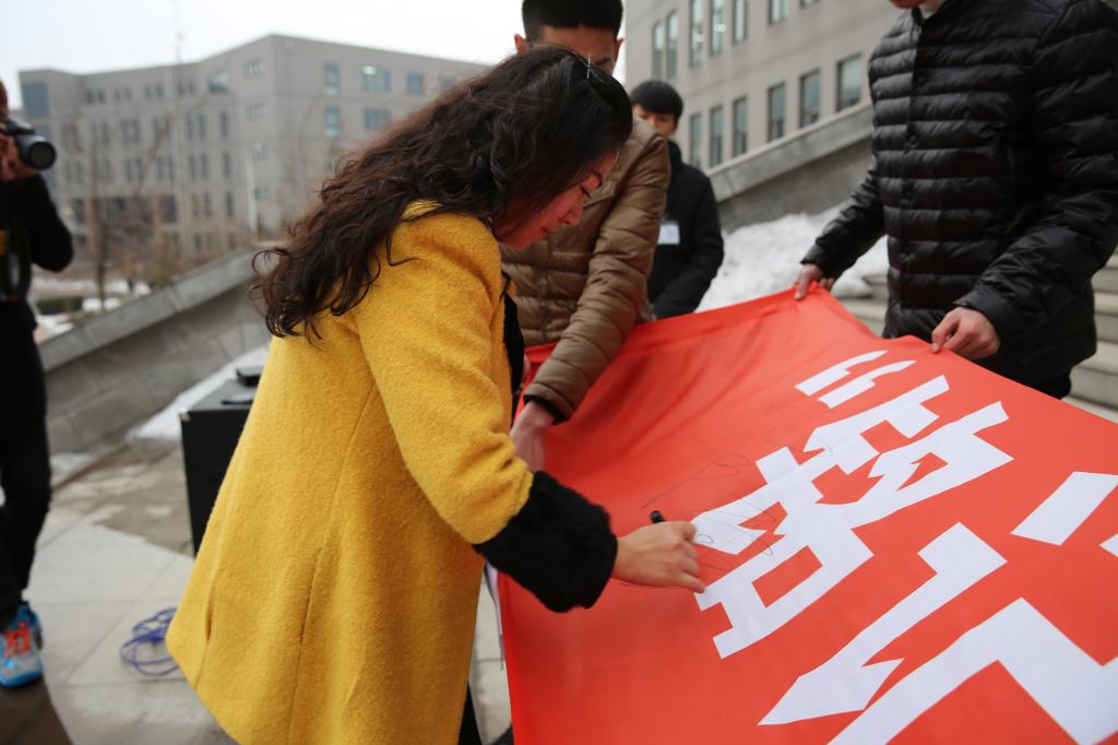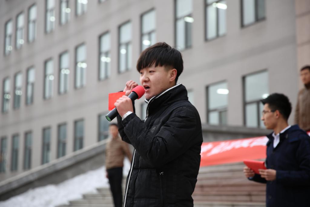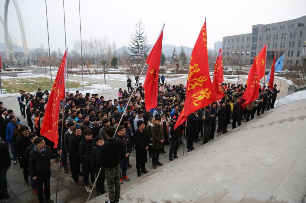 大会开始,在雄壮有力的伴奏声和大家的注视中,鲜艳的五星红旗缓缓走过台前。同学们在庄严肃穆的气氛中缅怀先烈,追忆革命年代峥嵘岁月,难忘“一二·九”和先烈们宝贵的精神。“铭记历史,勿忘国耻;热爱祖国,服务人民;勇于拼搏,积极创新;明道明德,求新求实……”学生们庄严的宣誓声在书韵广场上久久回荡。团委副书记管霞在讲话中指出:要传承伟大的“一二·九”运动精神,继承优良的革命传统和爱国主义精神,在新的历史条件下要坚定理想信念,勇担时代重任,自觉践行社会主义核心价值观,提升能力素质,努力练就过硬本领,改革创新、奋勇争先,为实现中华民族伟大复兴的中国梦作出贡献。