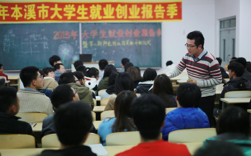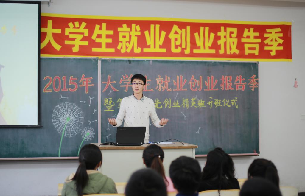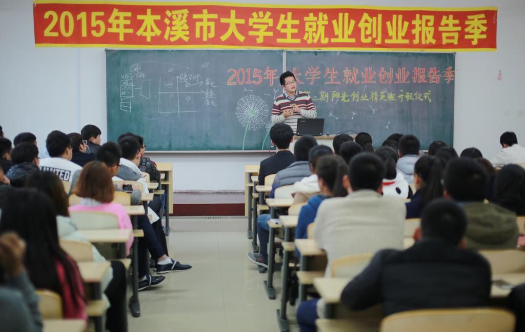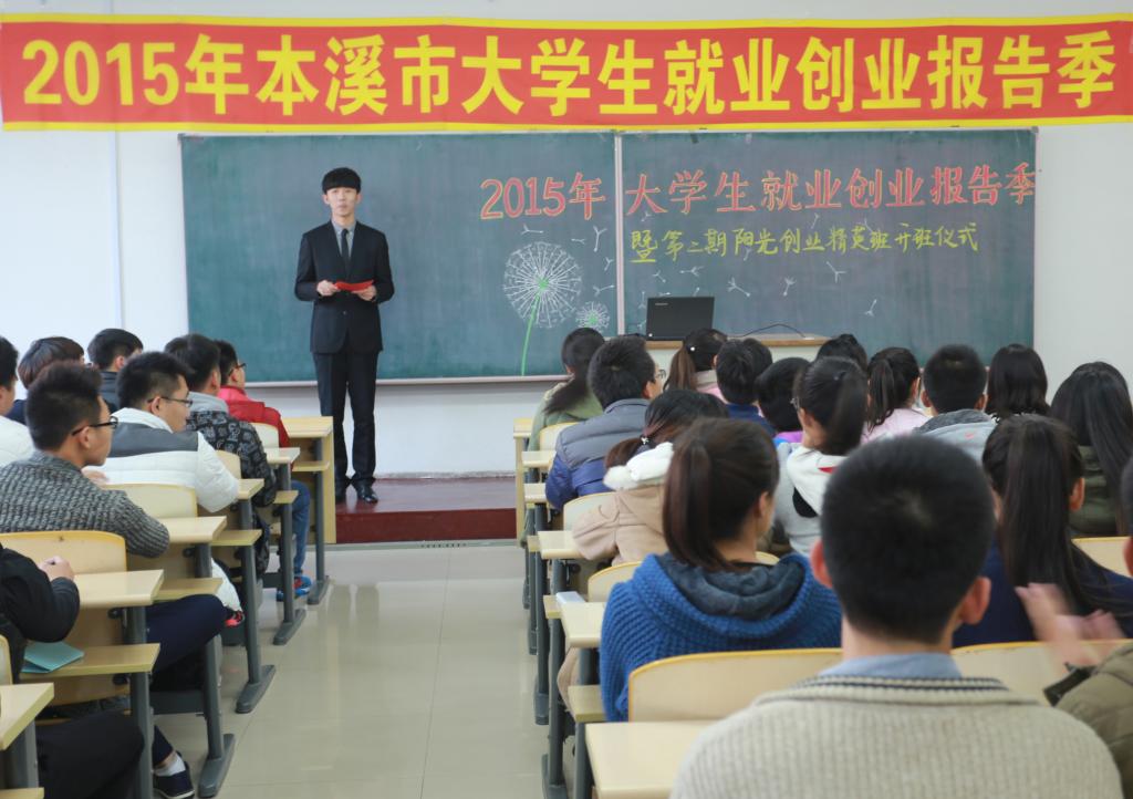 大众创业,万众创新。为培养“企业家型”复合型人才,探索我校人才培养模式改革新路,11月3日下午,校团委于B3410成功举行2015年本溪市大学生就业创业报告季暨第二期阳光创业精英班开班仪式。本次活动邀请了我校优秀毕业生霍鹏飞、张方远,作为2015年辽宁生优秀青年创业项目负责人与同学们一同分享创业经验。校团委书记唐梅、副书记管霞、团委干事刘慧以及团市委相关同志出席了本次活动。