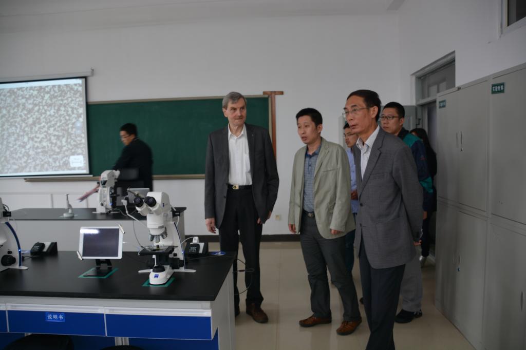 Lauri Holappa教授首先参观了冶金工程学院的金相平台、冶金虚拟仿真实验室、轧钢仿真实验室和电镜光镜实验室以及我校地质博物馆,Holappa教授对我校的实验室建设给予高度评价,并表示愿意促进两国、两校之间的交流合作。