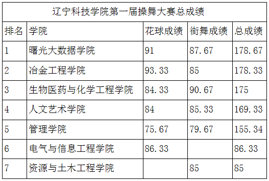 本次比赛分为街舞和花球啦啦操两个部分,经过了激烈的角逐,生物医药与化学工程学院、曙光大数据学院、人文艺术学院分获街舞比赛前三名;冶金工程学院、曙光大数据学院、电气与信息工程学院分获花球啦啦操比赛前三名。