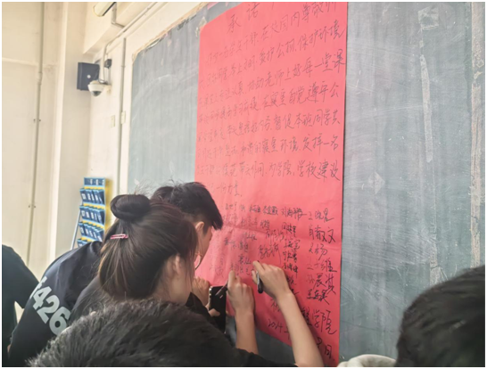 与会学生干部代表全体同学在日常行为规范承诺书上签字,大家纷纷表示,一定不辜负学校期望,带领全体同学不断提升自身的道德素养,养成良好的生活习惯和行为规范,共创文明寝室、文明课堂、文明校园,身先士卒、以身作则,发挥学生干部的先锋模范作用,为营造和谐、美丽的校园环境贡献自己的力量。