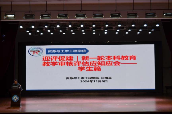 为迎接新一轮本科教育教学审核评估,使学生充分了解本科教育教学审核评估的重要意义,近日,在大学生活动中心,资源与土木工程学院召开教育教学审核评估学生应知应会讲座,教学副院长范海英主讲,全体新生参会。