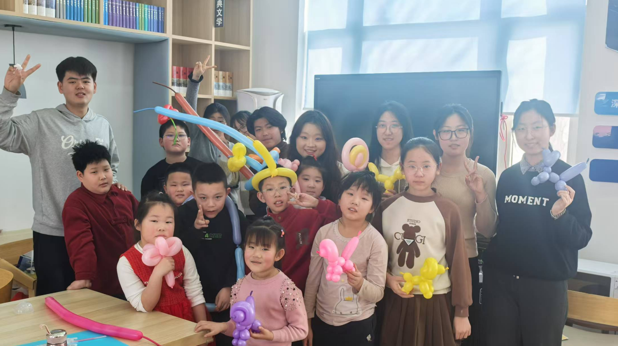 图为实践成员带领孩子们制作创意气球的合照