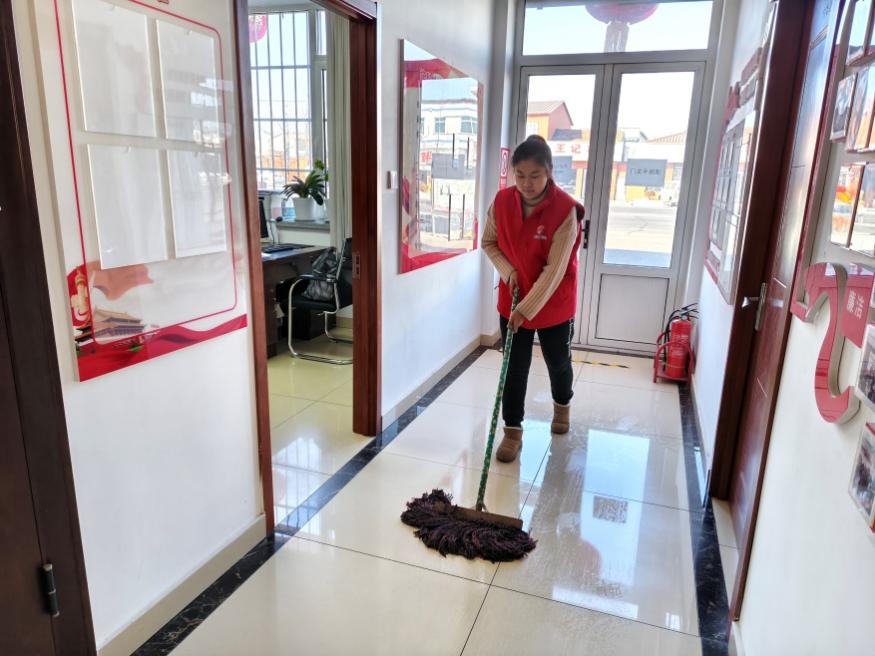 图为梁爱萍同学在村委会打扫卫生