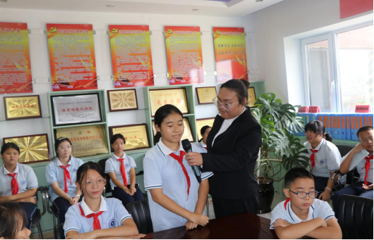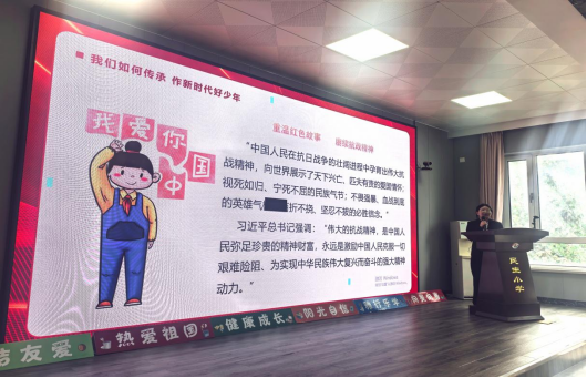 在民生小学,侯宝婷带领学生一起重温抗战故事,回顾那段波澜壮阔的历史,又与学生共同细数抗战小英雄用稚嫩肩膀扛起家国责任的伟大故事,激励大家学习伟大抗战精神,鼓舞大家作为新时代少先队员,接过抗战小英雄的接力棒,用实际行动传承抗战精神。