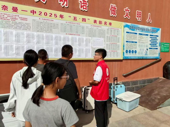 五年坚守迎新路,青春奉献暖母校。自2021年从奈曼旗第一中学毕业以来,任伟业同学连续五年以大学生志愿者身份,深情反哺、主动参与母校迎新工作。从最初熟悉流程的“新人志愿者”,成长为能独立统筹咨询引导、行李帮扶、校园讲解等多项任务的“核心骨干”,他始终以饱满热情、严谨态度投入工作:清晨布置迎新点位,烈日下协助新生办理手续,耐心为家长解答办学理念与生活细节,用真诚与行动让一届又一届的新生及家长感受到母校的温暖与关怀。
