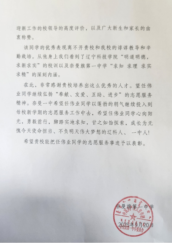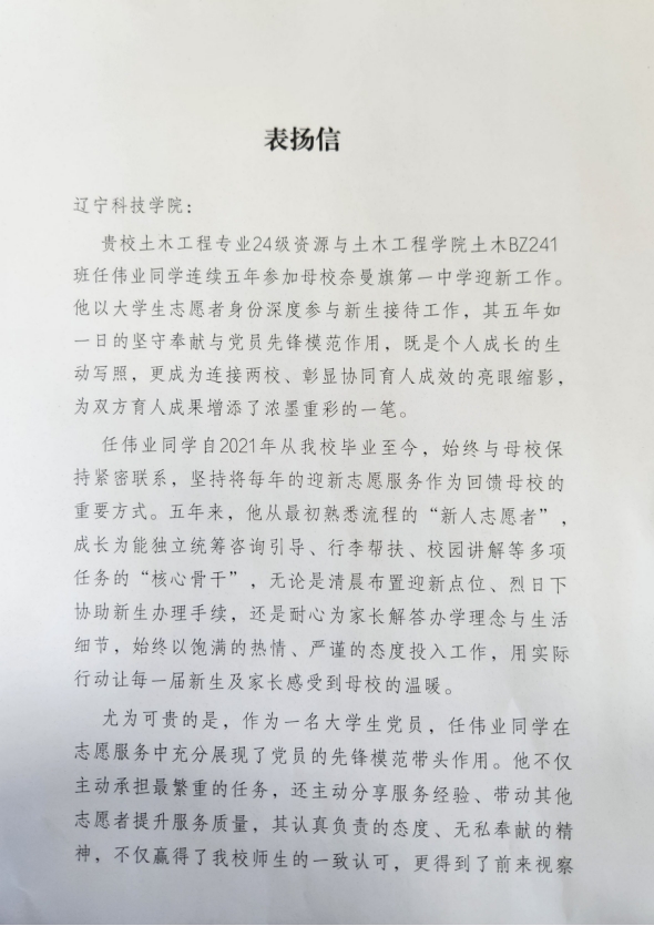近日,我校“一站式”学生社区服务中心学生骨干、资源与土木工程学院土木BZ241班任伟业同学接连收到来自内蒙古通辽市奈曼旗第一中学、内蒙古通辽市奈曼旗大沁他拉镇人民政府的表扬信,对其长期投身志愿服务一线、奉献社会的突出表现予以高度肯定和诚挚表彰。
