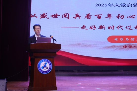 学院党总支书记陈溪为全体新生讲授入党启蒙教育专题党课。他以“从盛世阅兵看百年初心,以青春之我赴强国之约”为主题,带领同学们重温中国共产党不懈奋斗的光辉历程,深刻阐释了党的性质、宗旨、初心与使命。陈溪结合纪念中国人民抗日战争暨世界反法西斯战争胜利80周年阅兵式的震撼场景,讲述杨靖宇、张桂梅、杜富国等优秀共产党员的感人事迹,并深入解读了党的二十届三中全会精神。他指出,辽宁科技学院特有的“东北抗联精神+钢铁文化”双育人模式正是辽科人传承红色基因、锤炼钢铁意志的精神底色。最后,他向新生们发出号召:“加入中国共产党,就是选择与英雄同行,选择为国奉献。希望大家立抗联将士之志,修钢铁工匠之德,练钢筋铁骨之才,争做服务辽宁全面振兴的‘强国先锋’。”