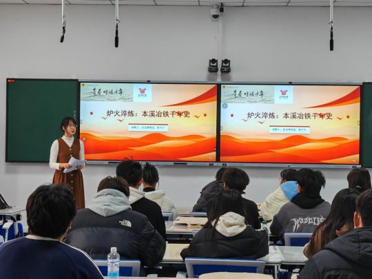 授课过程中,黄可宁以丰富的文物与史料为线索,从六千年前姜寨遗址的青铜器讲起,回溯至战国时期领先西方近两千年的生铁冶铸技术,生动展现了中国古代冶铁业的辉煌成就。聚焦本溪地区,她详细介绍了太子河流域蕴藏的30亿吨铁矿与301亿吨煤田所形成的“煤铁共生”资源情况,并结合战国铁钁、汉代铁甲片、明代威宁营铁场等实物与文献记载,清晰勾勒出本溪作为东北地区煤铁工业中心的历史发展脉络。在近现代篇章中,她讲述了1927年“八二三大罢工”中工人们的英勇抗争、1948年五万工人奋战36天修复高炉的动人场景,以及1949年本钢生铁产量占全国六分之一、1号高炉创下“三十连冠”等辉煌业绩,使学子们深切感受到一代代工业建设者的使命与担当。