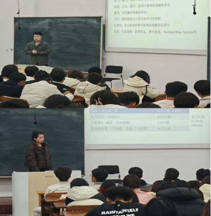 10月29日,外语学院青年教师牛慕阳与何湘钰走进电信学院,为全体大一新生举办了一场以“大学英语学习规划与四级备考”为主题的动员宣讲会。此次活动是两位老师担任电信学院兼职辅导员后的首场专题活动,旨在帮助学生明确英语学习目标,提升跨学科语言应用能力,为顺利通过四级做好充分准备。