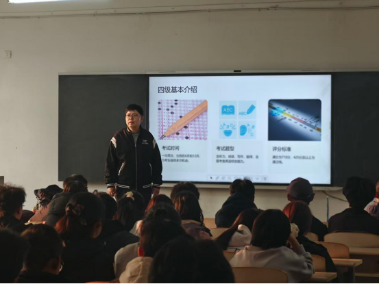 培训会上,栗东方聚焦大一新生对英语学习及四级考试的认知痛点,用通俗且直击需求的表述,清晰讲解四级考试基本信息。随后,他围绕科学备考核心展开系统指导,从英语四级如何准备,写作和听力技巧,翻译的备考方法,如何提升自我的英语素养等方面为同学们进行了讲解,强调储备充足的词汇量对翻译与阅读得分的重要性;针对写作、听力两大难点题型,拆解讲授了备考实用应试技巧,同时将英语学习与长远学习规划和发展相统一,让备考更具目标感,更让同学们深刻意识到:英语四级证书不仅是英语能力的“认证标志”,更是升学、就业竞争中的“加分筹码”。