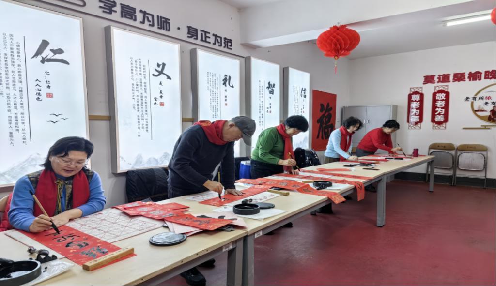 活动现场,书法班学员们摆开书案,摊开宣纸,挥毫泼墨、潜心创作,运笔如飞,红色的春联和热闹的人群将活动现场映衬的年味十足。他们饱含热情,丝毫不受寒冷天气影响,将真诚的祝福赋诸笔端。老同志纷纷赶来现场排队等候,互相谈论着各副春联的寓意。