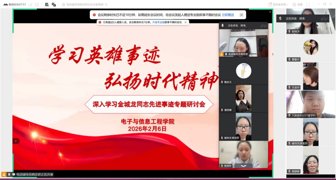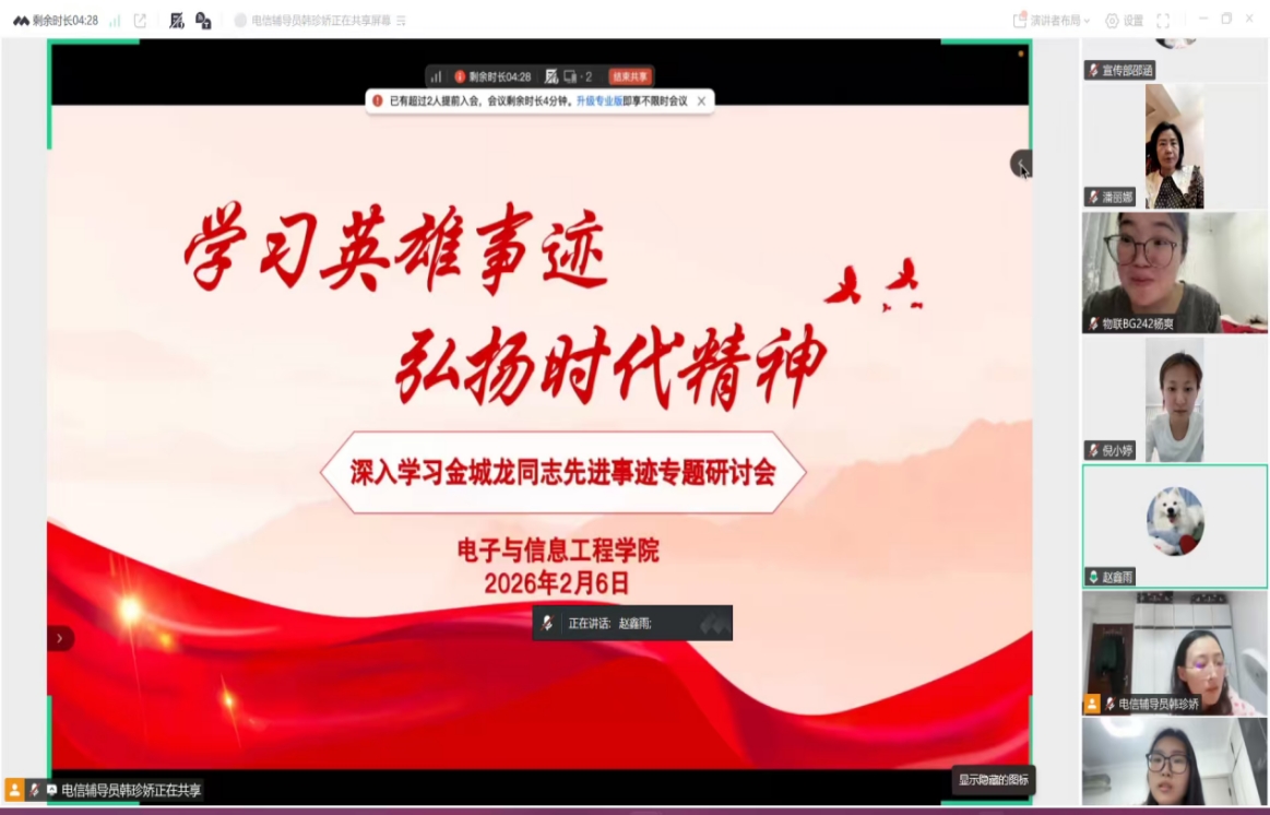 2月6日,电子与信息工程学院组织召开“深入学习金城龙同志先进事迹专题学习会”。学院党总支副书记潘丽娜主持会议,全体辅导员与学生干部齐聚云端,共同学习英雄事迹,感悟崇高精神。