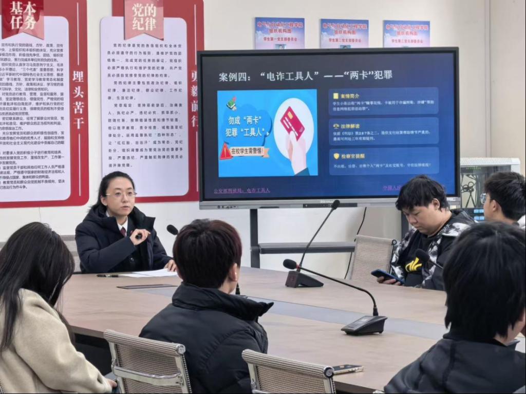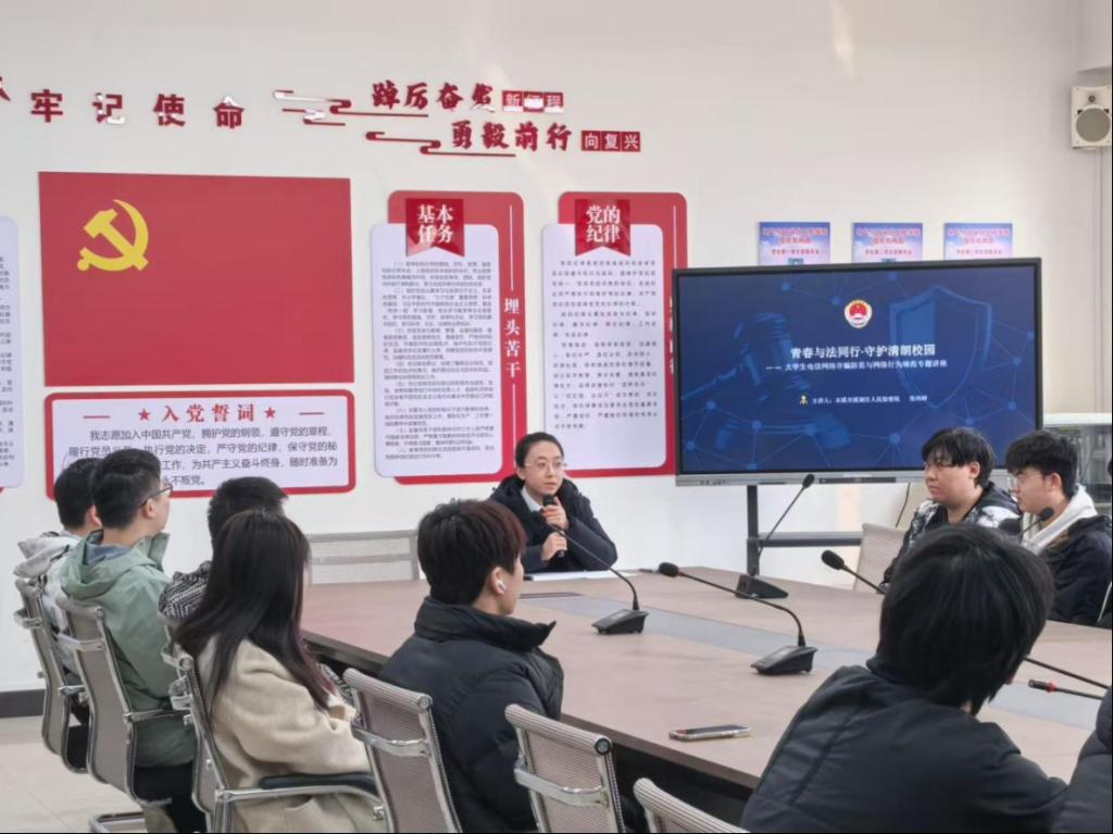 为切实提升学生网络安全意识与法治素养,有效防范电信网络诈骗,引导学生规范网络行为、守护校园安全,近日,电气与自动化工程学院邀请溪湖区人民检察院检察官走进校园,举办“青春与法同行守护清朗校园”专题讲座。学院相关负责人、辅导员及学生代表参加活动。
