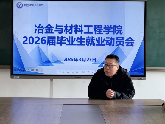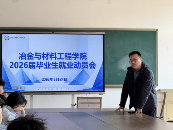 为扎实推进毕业生就业工作,帮助学生明确就业方向、提升就业竞争力,解决学生“慢就业、懒就业、缓就业”的难题,3月27日,冶金与材料工程学院在博思楼二区206会议室召开2026届毕业生就业动员会。会议由学院党总支副书记胡峰主持,院长孙野主讲,毕业生班主任、就业总指导员及30名2026届毕业生代表参加会议。