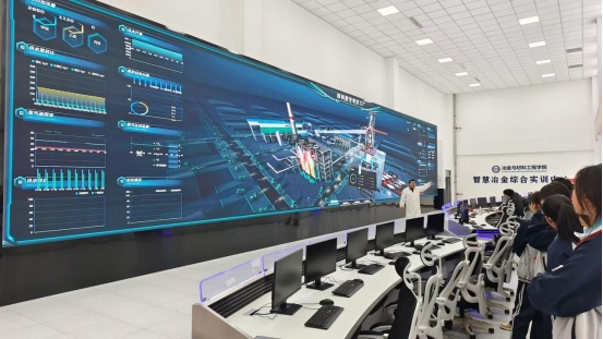 在学院学生志愿者的带领下,第十中学师生依次参观了智慧冶金训练平台与VR实验室,沉浸式感受冶金技术与智能科技的深度融合。在智慧冶金实训平台,实验室教师胡洋依托冶金全流程数字孪生系统,结合大数据可视化投影,为师生们生动讲解“钢铁是怎样炼成的”,全面展示了炼铁、炼钢、轧制三大核心钢铁生产工序,将原本枯燥抽象的冶金原理,通过动态模拟、数据还原的方式,化作清晰可视的工业场景,让师生们直观了解了从铁矿石到成品钢材的完整冶金产业链,亲眼见证大数据、数字孪生等前沿技术在现代钢铁工业中的创新应用,彻底打破了对传统冶金工业的刻板印象。