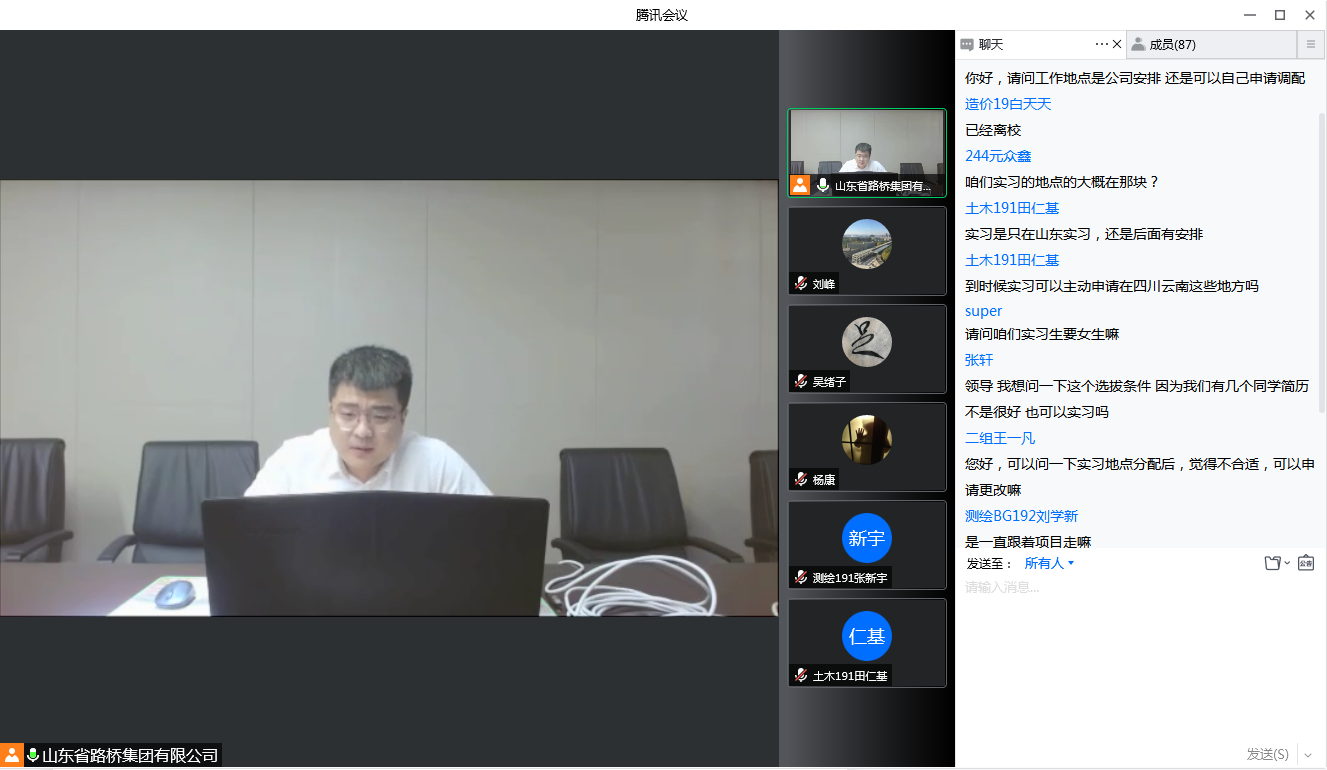 为更好地实现学生与实习单位双向选择平台“零距离”对接,确保资土学院2019级学生顺利实习并优质就业,6月8日,资土学院邀请山东省路桥集团有限公司采用线上方式举办顶岗实习和招聘宣讲会。资土学院班子成员、教研室主任、部分专业教师及2019级77名意向到该公司实习和就业学生参加了宣讲会,会议由学院副院长范海英主持。
